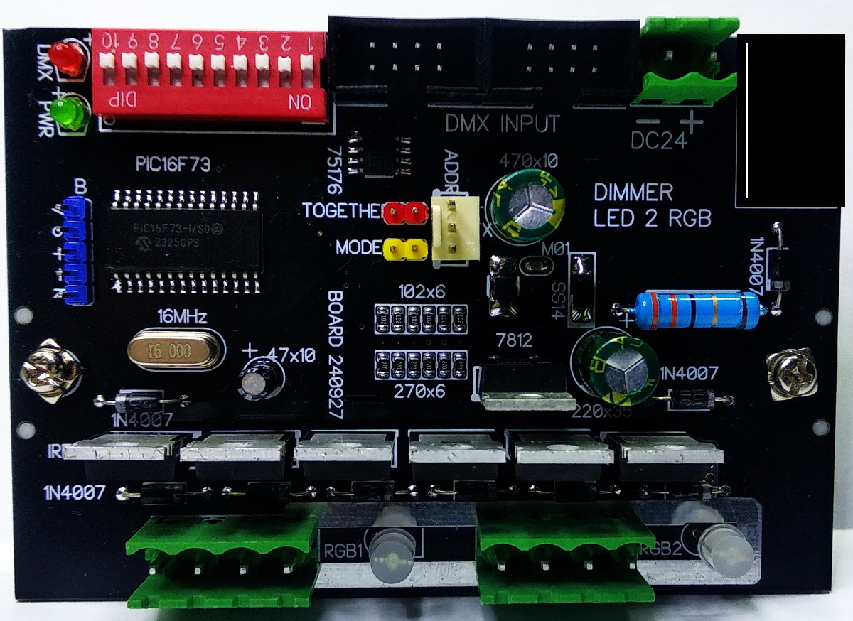 DMX512 LED диммер 2 RGB прожектора, открытая плата на DIN рейку