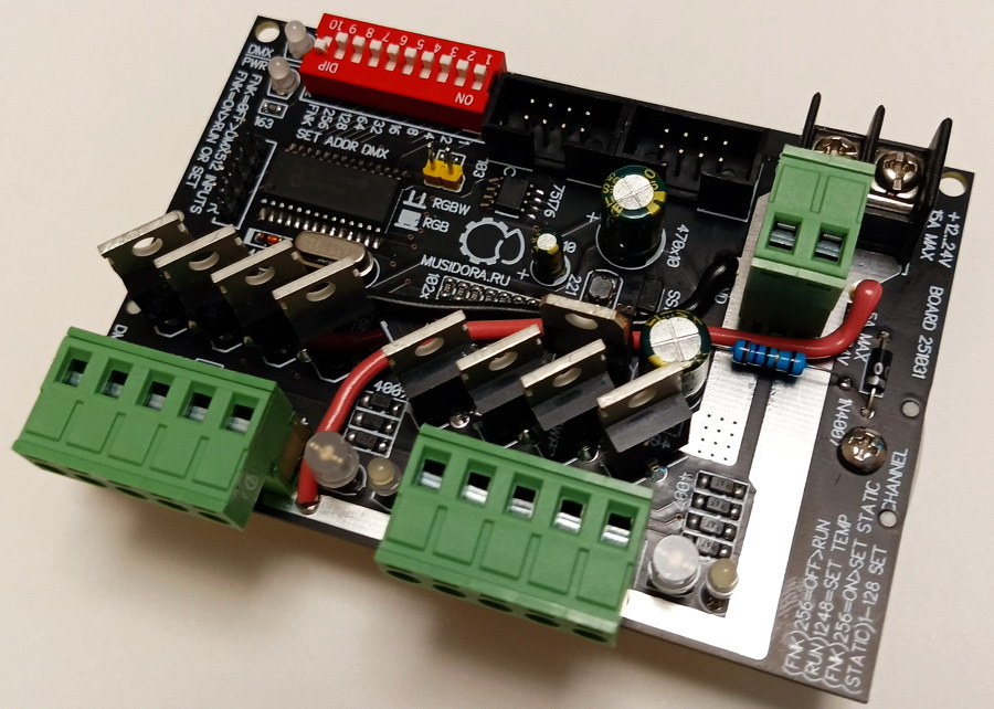 LED диммер для управления 4-мя независимыми RGBW прожекторами выполняется с использованием 12-ти DMX каналов.